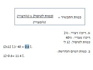 עליך להכין 12 ליטר תמיסה במים נגש פשפשים שתכיל פירטרואיד בריכוז 2%. הפירטרואיד נמכר בשוק בריכוז של 40% חשב את כמות פירטרואיד וכמות המים הנדרשת.