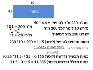 נקראת לטפל בחרקים מעופפים במחסן בשטח בעל אורך של 50 מ' ורוחב 4.6 מ'. עליך להשתמש בתכשיר המכיל 25% ח"פ מסוג פירטרואיד. המינון המומלץ הוא 10 ליטר תרסיס לכל 200 מ"ר. עליך למהול את התכשיר לריכוז של 0.25% . בכמה תכשיר תשתמש וכמה מדלל?