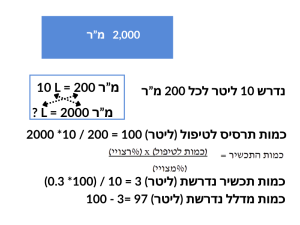 עלייך להדביר חגורה ברוחב 1מטר בצידיי שוליי בריכת מים באורך 12 מטר רוחב 2 מטר ועומק ממוצע 0.5 מטר כנגד זחלי יתושים.החומר המצוי ברשותך בריכוז של 5%.הריכוז הרצוי להדברה הוא בריכוז של 2 ppm. מינון הפיזור הוא 1 ליטר לכל 10 מ"ר. מצא את כמות התכשיר ואת כמות המדלל הנדרשת.